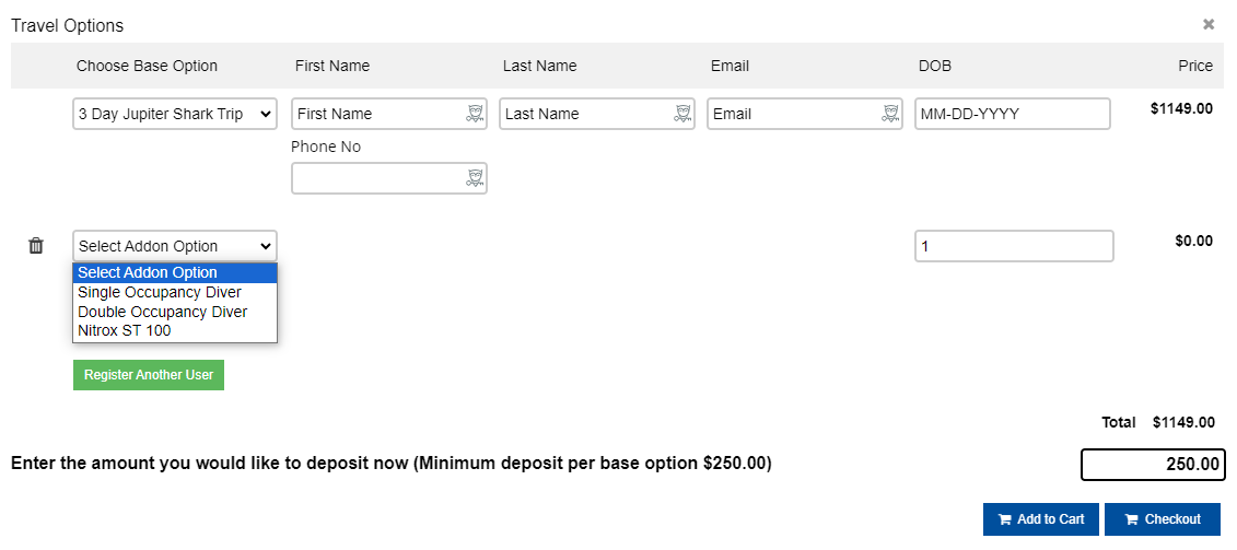 Next, you'll need to select the rooming / Diving option you want under the "Select Addon Option" for each traveler